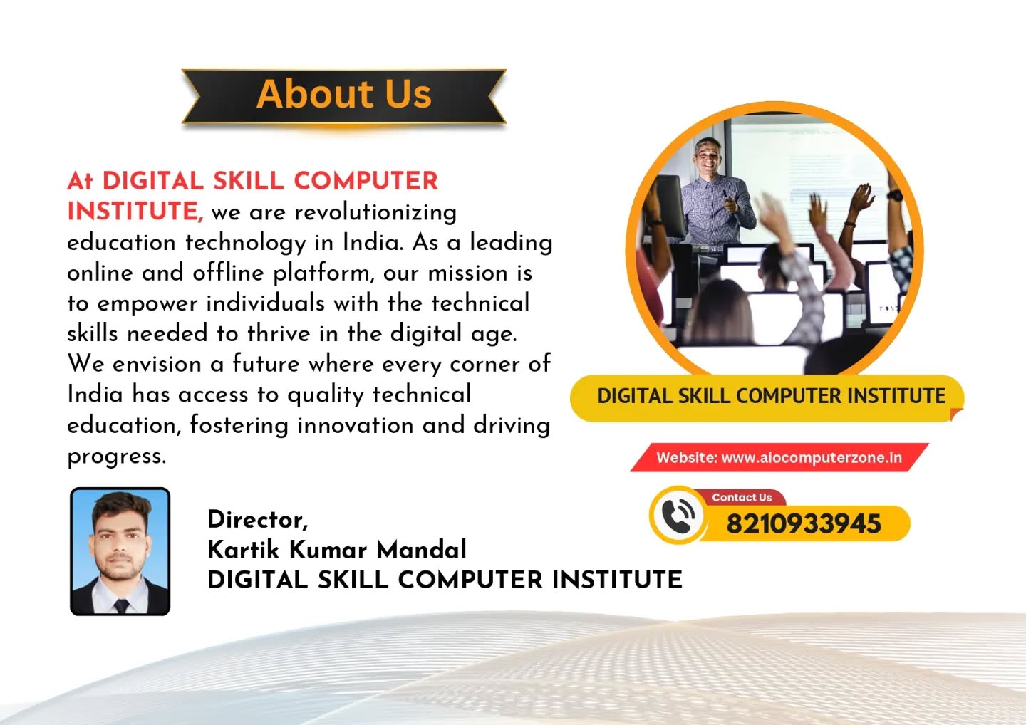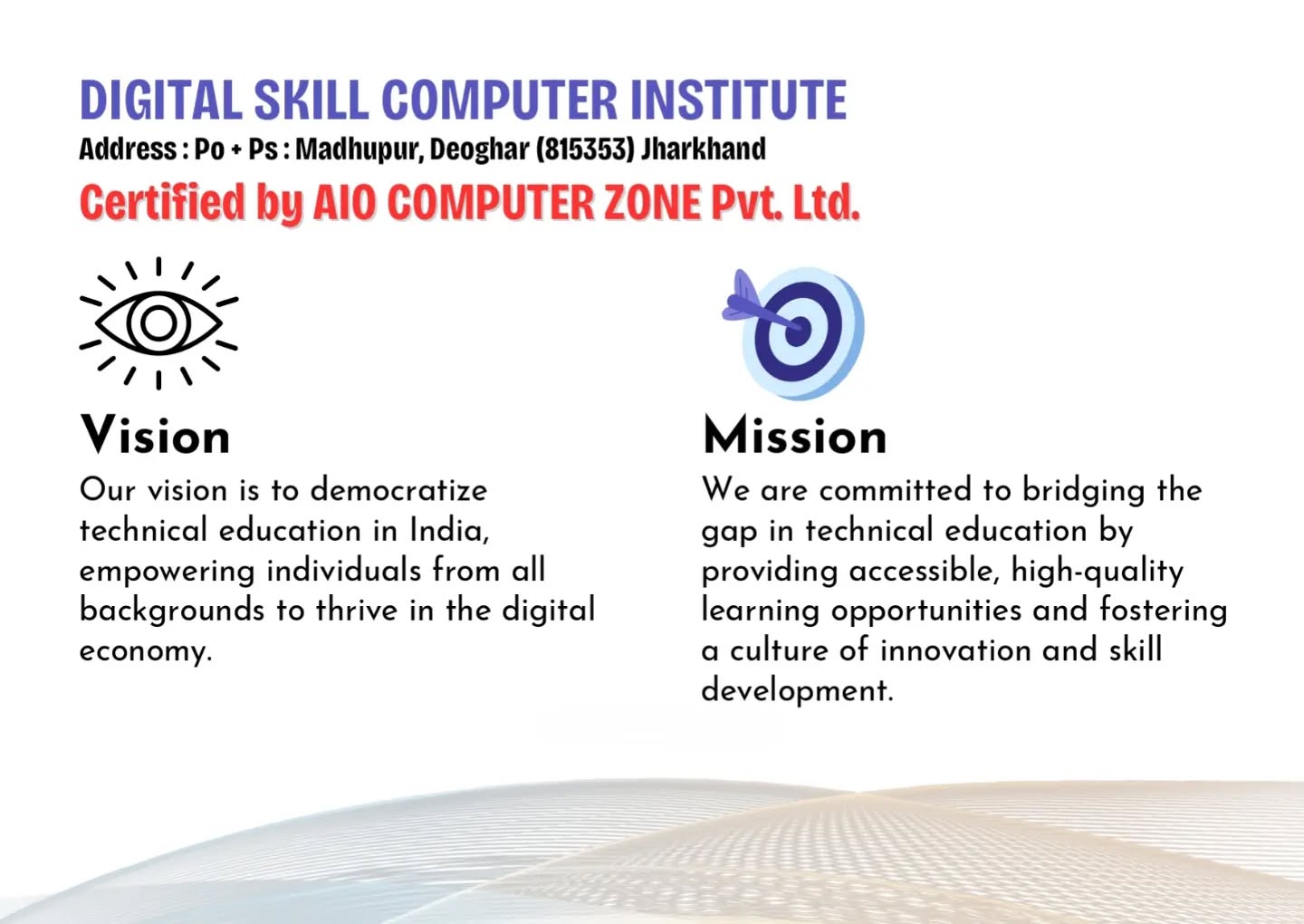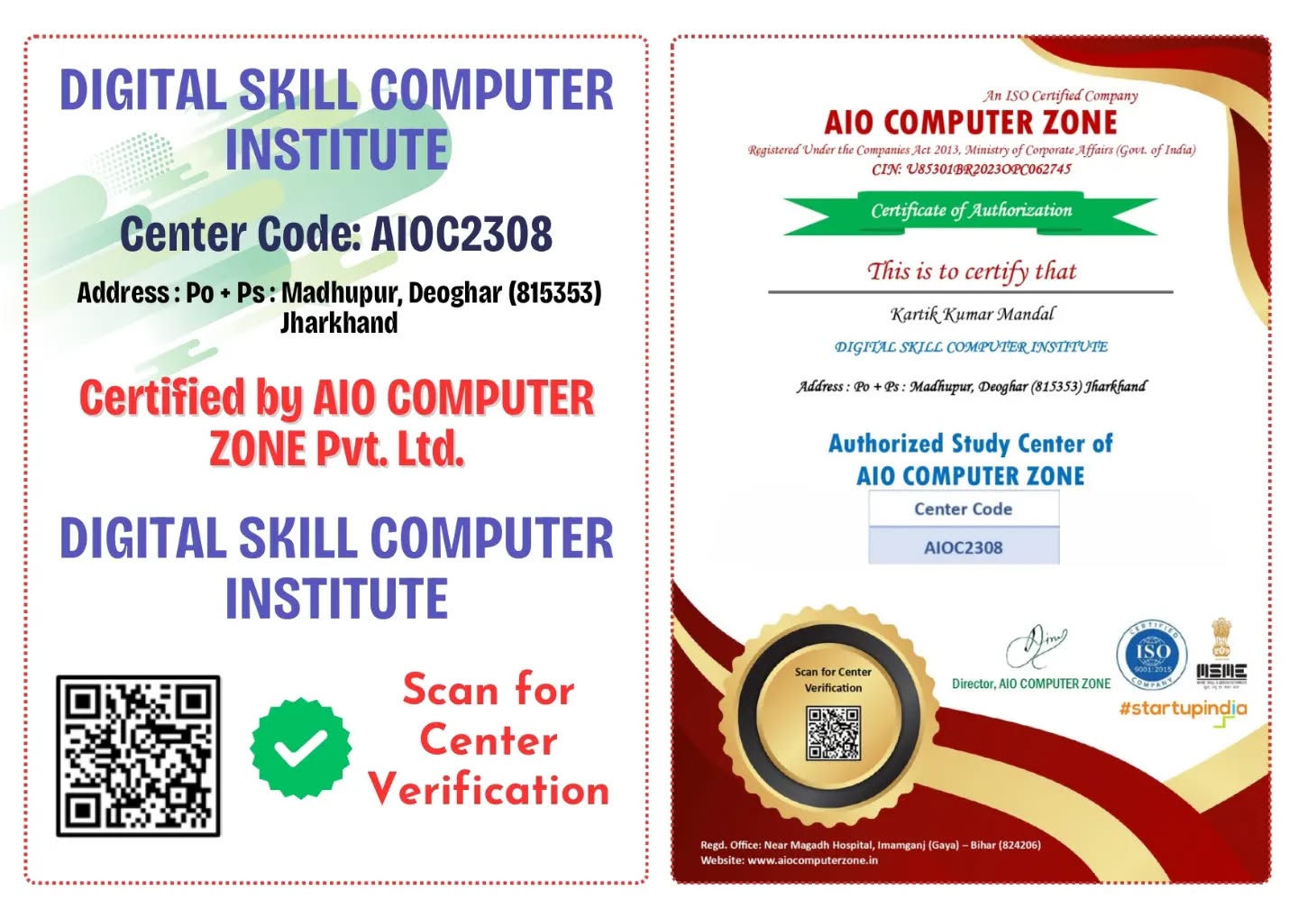 Welcome To DIGITAL SKILL COMPUTER INSTITUTE! ADD:- NEAR SHYAM MANDIR, KUNDU BUNGLOW, PO+PS-MADHUPUR,DEOGHAR (JHARKHAND) 815353.Certified by AIO Computer Zone Pvt. Ltd.